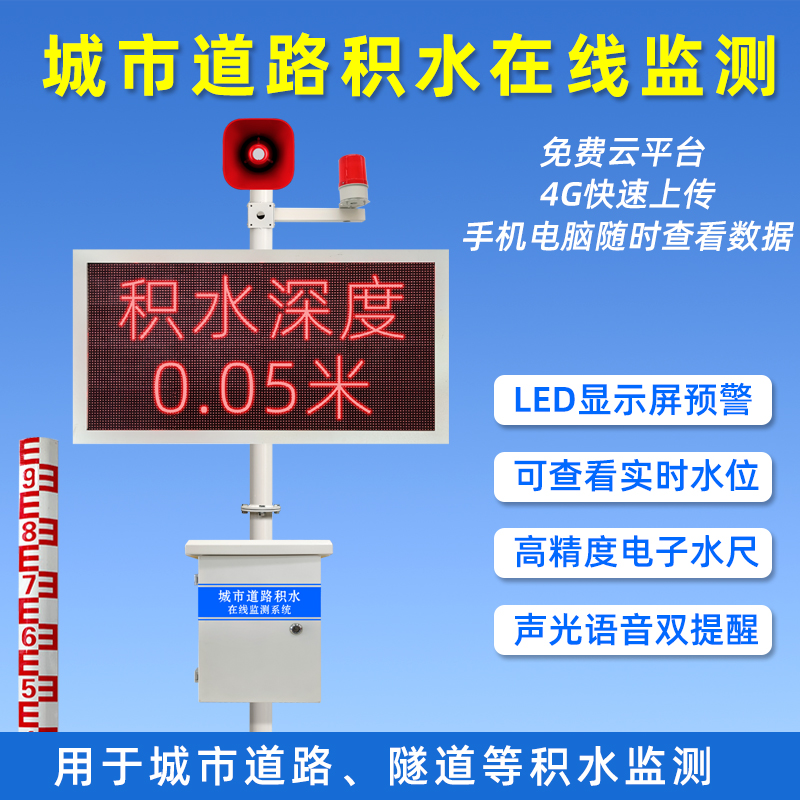 城市道路积水监测系统由LED显示屏、电控箱、报警灯、语音播报器、三米立杆、太阳能供电系统(选配)组成。电子水尺通过485通信,将测量到的水位信息传输到远程遥测终端,遥测终端将得到的水位值通过4G通讯模块,再传送到后台服务器,然后传送到手机、电脑上查看实时数据。同时可以将检测到的水位值,实时显示在LED屏上,水位超限会触发扬声器和语音播报双重报警,建立起城市内涝监测预警系统。